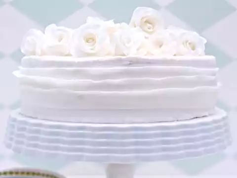 Knead 200 g fondant and roll out into a rectangle (10 x 60 cm) on a work surface dusted with icing sugar. Divide the rectangle into three parts lengthwise. Cover 2 strips well. Roll out the remaining strips very thinly lengthwise, so that they are about 75 cm long. Cut the strip straight from each side so that it is approx. 2 cm wide. Brush the bottom edge of the strip with a little water. Place the top edge of the cake once all around, press the bottom edge carefully and firmly. Process the remaining strips in the same way and stick them underneath the top strip. Decorate the cake with the roses