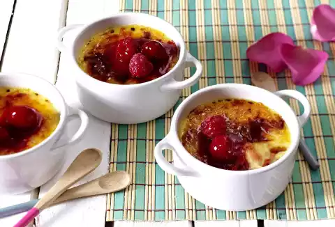 Sprinkle each crème brûlée with 1 tablespoon of sugar, caramelise with a kitchen gas burner or just under the preheated oven grill until golden brown. Serve the crème brûlée with the raspberry sauce.
