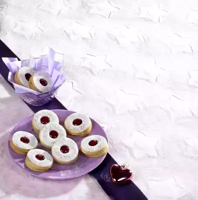 Meanwhile mix 50 g icing sugar and vanillin sugar. Place the circles and rings on a cake rack and allow to cool. Dust the rings thickly with the icing sugar mixture. Spread circles with rosehip jam. Place the rings on the circles. Fill the rest of the rosehip jam into a piping bag and fill the rings with it