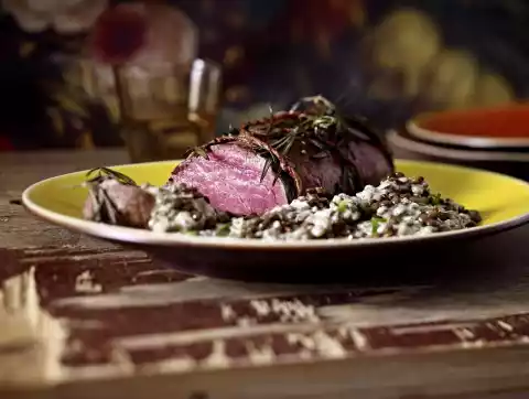 Season with salt and pepper. Put rosemary between meat and kitchen string. Fry briefly more. Cook in the preheated oven (electric cooker: 100 °C/ convection oven: not suitable/ gas: not suitable) for approx. 50 minutes