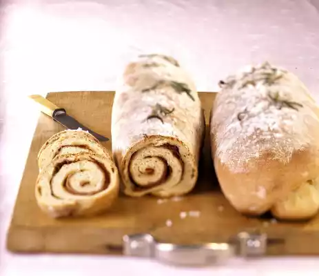 Sprinkle each rectangle with half of the chopped rosemary and cover each with half of the ham. Leave an approx. 2 cm wide edge free. Roll up both rectangles from the long side. Wrap the dough rolls at the ends. Put the dough rolls on 1 greased baking tray. Cover and let rise for about 30 minutes. Press one roll of dough a little flatter and wider with your hands. Cut the second roll of dough diagonally several times on the surface. Coat the dough rolls with oil. Sprinkle with sea salt and remaining rosemary. Sprinkle 1 teaspoon of flour over each. Let it rise again for another 30 minutes.