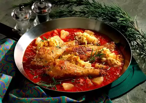 Heat oil in a pan and fry the chicken legs in it until golden brown all around. Add the tomatoes and rosemary and braise everything for 20 minutes. Season with salt and pepper. In the meantime, boil up plenty of salted water.