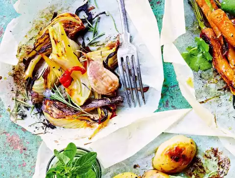 Mix fennel, garlic, pepperoni and rosemary with wine, olive oil, approx. 1 teaspoon salt and pepper. Spread on four pieces of baking paper in the middle. Take the paper all around the filling and close it.