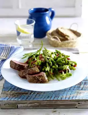 Then for a pink roasted lamb salmon fry on medium heat for 2-3 minutes on each side. Season with salt and pepper. Fry the rosemary briefly. Season bean salad again. Arrange everything. Baguette tastes good with it.