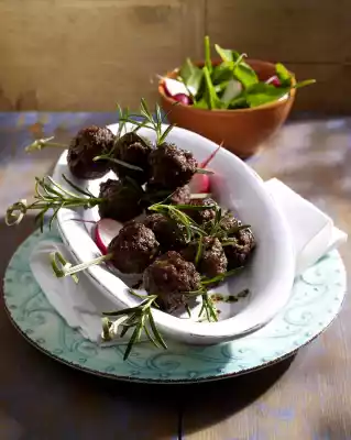 Wash the rosemary and dab dry. Remove the needles from 2 twigs and chop finely. Knead minced meat, breadcrumbs and rosemary. Season with salt and pepper. Form into 24 small balls and put 3 on each skewer.