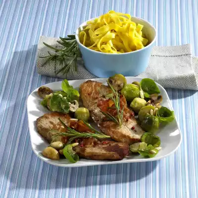 Halve the bacon slices. Drain bacon in a large pan without fat, remove from the pan and keep warm. Heat 2 tablespoons of oil in the pan, fry the mushrooms in it while turning. Add Brussels sprouts, fry briefly and season with salt and pepper. Add pine nuts. Heat 2 tablespoons of oil in a large frying pan and fry the meat for 2-3 minutes on each side. Add rosemary shortly before the end of the frying time. Season cutlets with salt and pepper. Pour the noodles into a sieve, quench and drain. Sprinkle schnitzel with 1 teaspoon of pink berries and cover with slices of bacon. Serve with vegetables on plates. Garnish with rosemary. Add the pasta in a small bowl