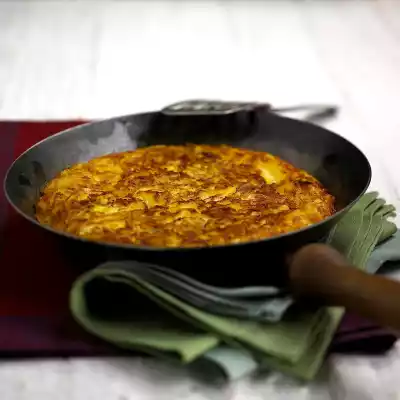 Turn the Rösti after another 2 minutes. Drizzle with some butter-milk mixture and turn and drizzle at 2 minute intervals until the Rösti is golden brown all round.