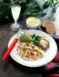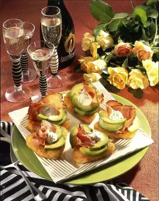 Cut the flesh into half rings and sprinkle with lemon juice. Then spread on the Rösti corners. Place 1 slice of ham and some crème fraîche on each. Serve sprinkled with pepper.