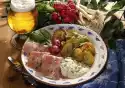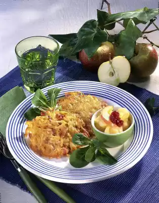 Cook for 8-10 minutes at low heat, stirring occasionally, until compote. Add the apple slices about 4 minutes before the end of the cooking time and cook along. Leave to cool. Cut bacon into small cubes. Peel and finely chop the onion. Peel, wash and coarsely grate potatoes. Mix bacon, onion, potatoes, egg yolk and flour. Season with salt and pepper. Heat oil in a pan and fry 4-5 potato pancakes on both sides until golden brown.