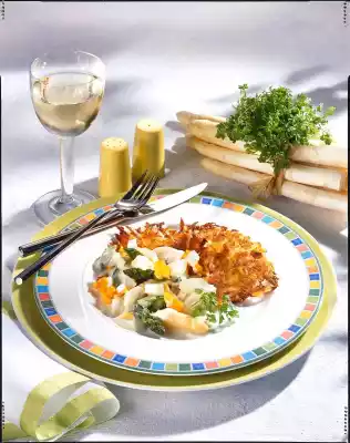 Boil up the asparagus stock while stirring. Refine with cream and bind slightly with binding agent. Season the sauce with salt, pepper and some lemon juice. Heat the asparagus in the sauce. Peel, dice and fold in the egg. Serve with the Rösti