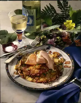 Mix potatoes, onions and egg. Season with salt and pepper. Fry in portions in hot oil at medium heat on each side for about 3 minutes. Serve rösti and creamed mushrooms, sprinkled with chives, and served with turkey breast.