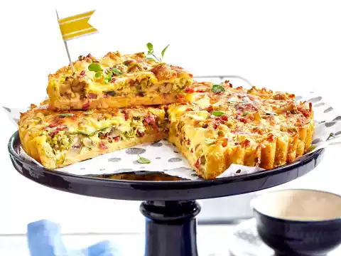 Mix well with flour and 1 egg. Season with 1 teaspoon salt, pepper and a pinch of nutmeg. Press the mixture into the mould to form a base, forming a rim. Bake in a hot oven on the lowest shelf for about 15 minutes (see