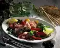 Chop the walnuts. Wash and chop the herbs. Dab meat dry and tap flatter. Spread with sour cream and season with salt and pepper. Spread herbs and walnuts on top. Roll up meat into roulades and pin them with wooden skewers.