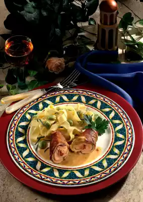 Dab schnitzel dry. Wash parsley, dab dry. Pluck some leaves. Put the rest aside for garnishing. Put the slices of bacon and parsley leaves on the cutlet slice. Put tomato paprika in the middle and roll up into a roulade. Wrap with kitchen string or hold together with roulade skewers. Season with salt and pepper and fry well all around in hot oil. Fry for 15-20 minutes until done. In the meantime, cook the pasta and beans in boiling salted water for 10 minutes. Drain and let drain well. Coarsely chop the sage. Melt the fat. Add sage and noodles with beans and toss in. Remove roulade from the pan, remove yarn or skewers. Keep meat warm for a short time. For the sauce, peel onion, dice finely and sauté in the frying fat. Add stock and cream and let it boil down a little. Thicken with sauce thickener. Heat roulade briefly in the sauce and arrange on a preheated plate with beans, noodles and sauce. Garnish with remaining parsley
