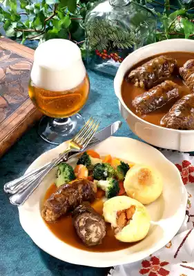 Season to taste with salt and pepper. Put the roulades back into the sauce. Heat the rest of the butter in a frying pan, sauté the broccoli and carrots in it and season to taste with salt and pepper. Arrange roulades, dumplings and vegetables together.