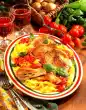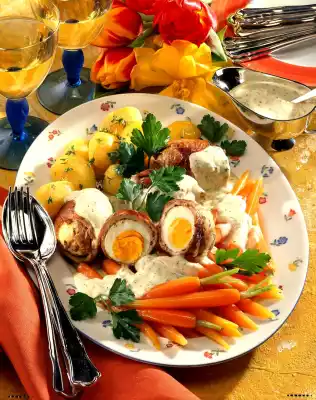 Boil eggs in boiling water for about 10 minutes until hard and peel them. In the meantime peel and wash potatoes and carrots. Cook potatoes in boiling salted water for about 20 minutes, carrots in boiling salted water for 12-15 minutes. Wash the meat, dab dry and tap flatter. Brush with mustard and season with salt and pepper. Roll 1 egg in each and fix it.