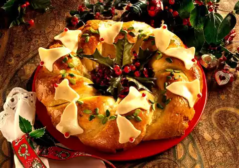 Spread cherries on top. Roll up each lengthwise and gobble into a cord. Form into a wreath. Whisk the egg yolks and milk together. Coat the wreath. Bake in the preheated oven (electric cooker: 175 °C/ gas: level 2) for about 1 hour.