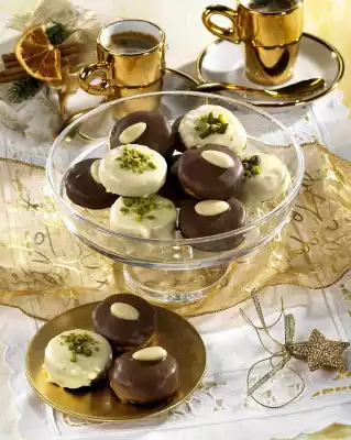 Bake in a preheated oven (electric cooker: 200 °C/ convection oven: 175 °C/ gas: level 3) for approx. 10 minutes. Then allow to cool. Chop the chocolate coatings and melt them separately on a hot water bath. Chop the pistachios. Dip half of the cookies in white chocolate coating and sprinkle with pistachios. Dip the remaining cookies in dark chocolate and decorate with 1 almond each