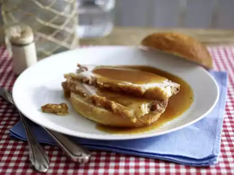Cut the meat into about 20 slices. Cut open round pieces. Cover the lower halves with 2 slices of roast meat and pour sauce over each. Add the lids of the rounds.