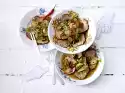 Clean or peel the vegetables, wash and cut them into pieces. Peel onions and cut into slices. Wash the meat, dab dry and cut the rind crosswise. Rub with salt and pepper.
