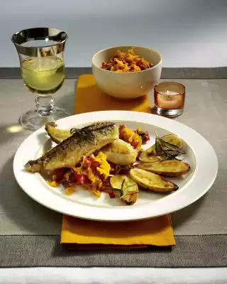 Peel ginger and garlic and dice very finely. Dice gingerbread or honey cake as well. Wash the rosemary, shake dry and pluck half of it into pieces. Remove the remaining rosemary needles and cut finely. 10 minutes before the end of the cooking time, sprinkle 3/4 of the plucked rosemary on the potatoes. Wrap the pumpkin in a tea towel and squeeze the liquid well and collect it. Heat 2-3 tablespoons of oil in a wide saucepan. Sauté peppers, ginger, half of the garlic and chopped rosemary in it. Add honey and pumpkin and continue steaming at low heat for about 8 minutes (possibly add some of the liquid that has been removed??). Stir from time to time. At the same time, wash the gilthead fillets, dab dry and cut in half. Dust skin side with flour. Heat 30 g butter in a large pan and fry the fillets on the skin side at medium heat for 3-5 minutes.