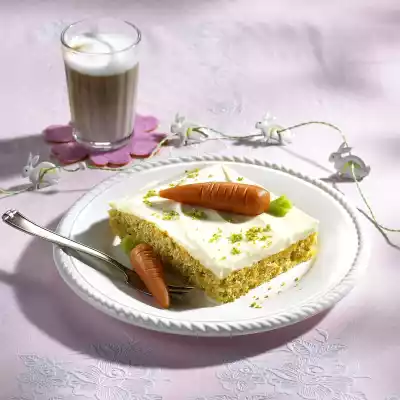 Put in a cool place. Knead the marzipan and 25 g icing sugar. Colour 2/3 of the marzipan orange with red and yellow food colouring. Knead the remaining marzipan with green food colouring. Form approx. 24 carrots from the orange-coloured marzipan. Decorate with green marzipan. Cut the cake into pieces and decorate with the marzipan carrots