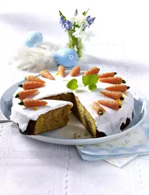 Add carrots and fold in. Pour into a greased springform pan (26 cm Ø), smooth down and bake in a preheated oven (electric range: 175 °C/ convection oven: 150 °C/ gas: level 2) for 35-40 minutes. Remove from the oven, place on a cake rack and remove from the edge of the springform pan. Immediately sprinkle with 100 ml orange juice and let cool off. In the meantime knead marzipan and 50 g icing sugar. Colour orange with food colouring. Form 18 carrots from it, press grooves into the carrots with the back of a knife. Press pistachios as green into the top. Remove the cake from the tin and place it on a cake plate. Spread with orange marmalade. Stir 250 g icing sugar, egg white and possibly 1/2-1 tbsp water until smooth. Spread evenly on the cake, let it rise a little.