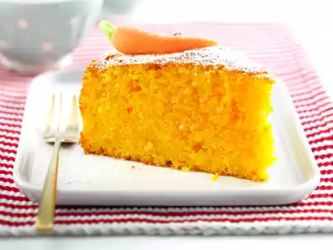 Remove the cake from the mould and dust with 1 tablespoon of icing sugar. Decorate with marzipan carrots.