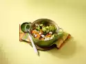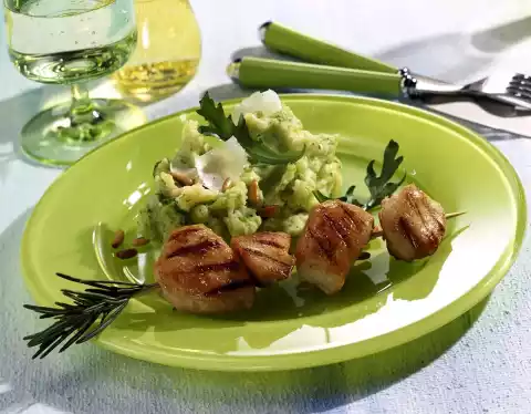 Season with salt and pepper. Skewer chicken snacks on wooden skewers as desired and arrange on plates together with the rocket mashed potatoes. Sprinkle with pine nuts. If necessary, sprinkle with parmesan slices and garnish with rocket leaves and serve.