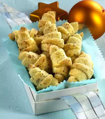Use a cake divider to divide the dough into 16 pieces (alternatively, use a knife to cut it into approx. 16 pieces). Process the rest of the dough in the same way. Roll up the cake into croissants, starting on the broad side and rolling up to the top. Place the tip downwards on 2 baking trays lined with baking paper. Bake the trays one after the other in a preheated oven (electric range: 175 °C/ convection oven: 150 °C/ gas: level 2) for approx. 12 minutes