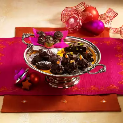 Form cams with 2 teaspoons and place on a tray lined with baking paper. Dip the spoon into water again and again. Chill for about 30 minutes. Roll the cams in grated chocolate. Dust half of the pralines with cocoa and icing sugar