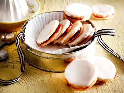 Remove, place on a cake rack and let it cool down. Stir the jam until smooth. Brush half of the cookies with jam. Place one of the remaining biscuits on each coated biscuit.