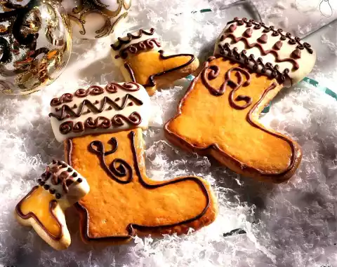 Separate 1 egg. Put the basic mixture, 1 egg, 1 egg white, fat and rum aroma in a mixing bowl. Mix to a smooth dough with the whisks of the hand mixer. Wrap the dough in foil and put in a cool place for approx. 2 hours. Roll out the dough on a floured work surface 3-4 mm thin and cut out boots with two different sized cutters (12.5 and 4-5.5 high boot cutters).