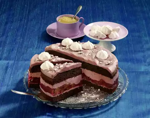 Spread 1/4 of the cream on the lower cake base and chill for about 15 minutes (until the cream is firm). Pour cold compote onto the firm cream. Spread 2/3 of the cream on the compote and finish with the sponge cake. Spread the rest of the cream on the sponge cake in waves. Put the cake in a cool place for at least 4 hours. Crumble 2 meringue tuffs. Remove the cake from the cake ring and decorate briefly with meringue tuffs, crumbled meringue and sugar pearls. (Meringue will dissolve after a while)