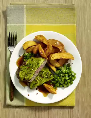 Chop 50 grams of peas finely and stir into the mixture. Season pea puree with salt and pepper. Heat oil in a pan. Season the steaks with salt and pepper and fry briefly on both sides. Remove the steaks from the pan, brush one side with the pea puree and grill under the grill for three to four minutes. Deglaze the frying pan with broth. Simmer the sauce for one to two minutes, season with salt and pepper and thicken slightly with sauce thickener. Remove the meat from the oven and let it rest for five minutes. Melt butter. Peel onion and chop finely.