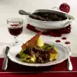 Squeeze 1 orange. Deglaze the gravy with cream and orange juice. Let it boil down a little bit until the sauce thickens. Add green pepper. Season orange sauce with curry, salt and ground pepper. Peel the remaining orange so that the white skin is completely removed. Cut out the pulp between the parting skins. Heat briefly in the sauce