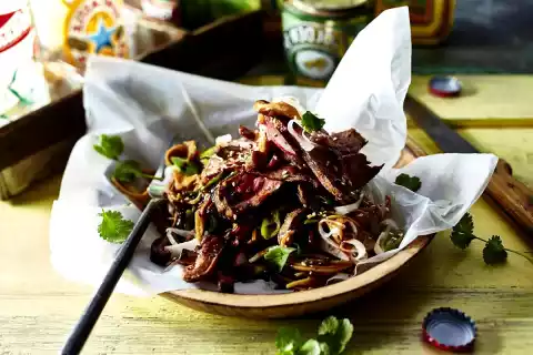 Remove meat from the marinade and cut into thin slices. Add the marinade to the pasta mixture and mix everything well. Season to taste again if necessary. Serve the noodle salad with the meat. Sprinkle with sesame and coriander.