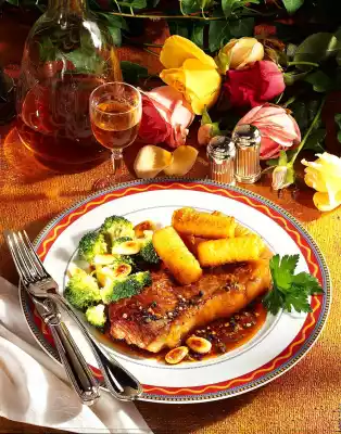 Heat the fat. Chop the almonds and roast them in it. Drain broccoli. Arrange everything. Spread the almonds over the broccoli. Sprinkle steaks with coarse pepper. Serves with: croquettes