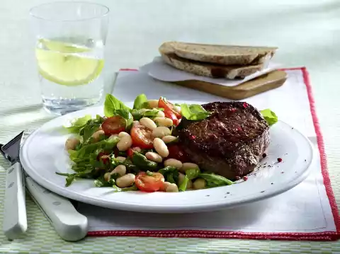 Gradually mix in the olive oil. Season to taste with salt and pepper. Mix beans, tomatoes, rocket, spring onions, basil and vinaigrette. Arrange a steak and salad on plates. Sprinkle with pink pepper berries. Serve with brown bread
