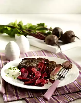 Season with salt and pepper. Season steaks with pepper and arrange on plates with chips and sour cream.