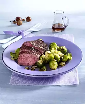 Clean and wash the Brussels sprouts and cut them crosswise on the stem. Cook the sprouts in boiling salted water for about 10 minutes. Chop hazelnuts coarsely. Heat the fat in a pan and fry the nuts. Drain and drain the Brussels sprouts, add to the pan and fry for 3-4 minutes at medium heat, season with salt and pepper.