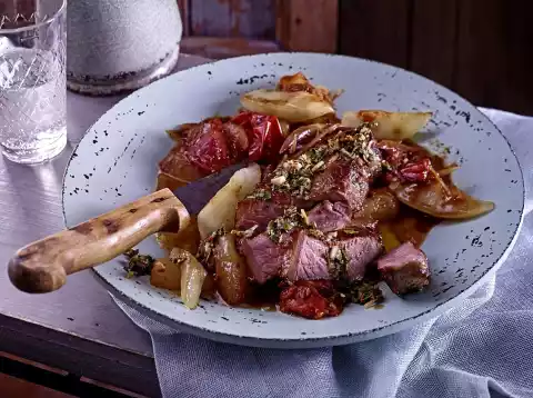 Place the tomatoes in the pans, season with 1 tablespoon of vinegar, sugar, salt and pepper and braise in the closed pan for about 10 minutes. After about 5 minutes, distribute the melon in the pans. Arrange vegetables, meat and chimichurri on plates