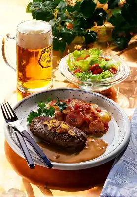 Season to taste with salt and pepper. Arrange the steaks in the sauce on preheated plates and garnish with parsley. Serve with fried potatoes and a fresh salad.