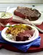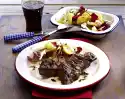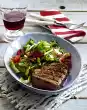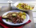 Remove meat from the pan, season with pepper and wrap in aluminium foil. Let it rest for a short time. Arrange grilled vegetables and rump steaks on plates. Baguette tastes good with them.