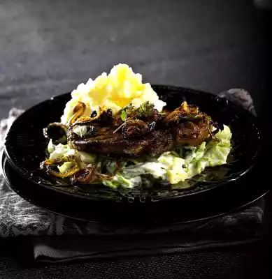 Wash the steaks and pat them dry. Cut the fat edge several times. Heat 1 tablespoon butter. Sauté the onion cubes in it. Add savoy cabbage, season with salt and pepper and fry for about 10 minutes. Deglaze with stock and whipped cream, finish cooking for another 5 minutes.