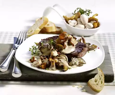Season to taste with salt and pepper. Arrange the steaks with the mushroom cream on plates. Garnish with thyme. Baguette tastes good with it.