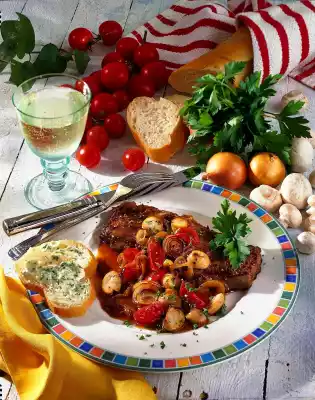 Arrange steaks with the sauce on plates. Sprinkle with parsley and serve garnished as desired with a parsley leaf. Serve with baguette with herb butter.