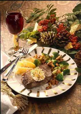 Fry steaks in hot oil for 3-4 minutes on each side. Season with salt and pepper, remove from the pan and keep hot. Add chanterelles to the frying fat and fry. Let the potatoes boil down a little in an open pot, season with salt, pepper and nutmeg. Add broccoli to the mushrooms, heat up, season with salt and pepper. Arrange steaks, potatoes and vegetables. Put butter rosettes on the steaks, sprinkle with coloured pepper