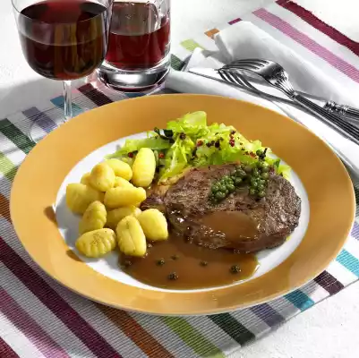 Clean the pointed cabbage, remove the stalk. Wash cabbage and cut into strips. Cook gnocchi in boiling salted water for 2-3 minutes. Drain. Season steaks all around with salt and pepper. Heat 2 tablespoons of oil in a frying pan and fry the steaks on each side for about 3 minutes.