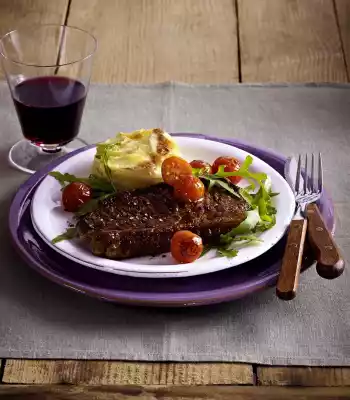 Cut out 4 circles from the gratin with a cutting ring (approx. 7.5 cm) and arrange on plates together with the steaks, tomatoes and salad
